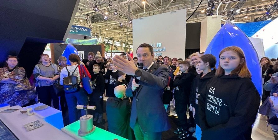 Презентацию стенда для более чем 10 детей в свитшотах «На севере - жить!» губернатор провел сам. Он рассказал им, почему не замерзает Кольский залив.