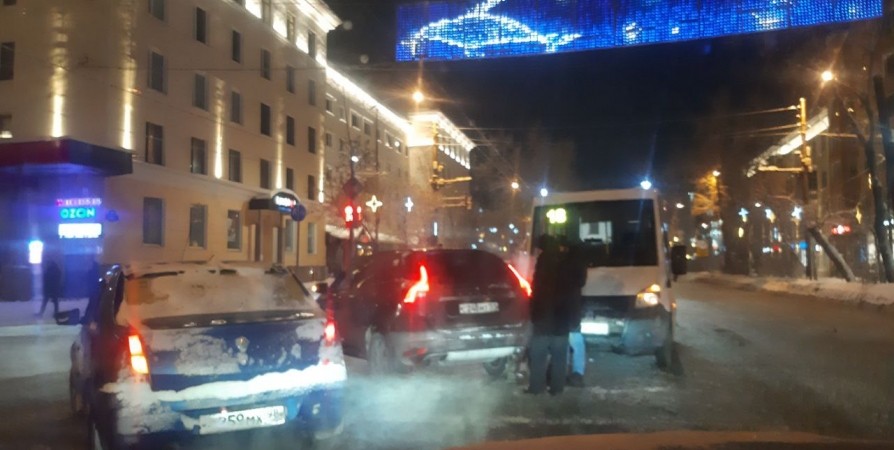 Из-за аварии с маршрутным такси в районе перекрестка пр. Ленина и ул. Дзержинского в Мурманске затруднено движение, сообщили очевидцы события.