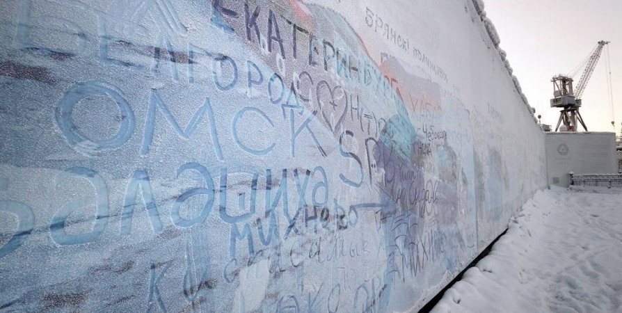 У морского вокзала в Мурманске появилась новая спонтанная достопримечательность, созданная природой. Морозы покрыли инеем баннеры у ледокола «Ленин», сообщил телеграм-канал «На Мурманск | Всё о Кольском полуострове».