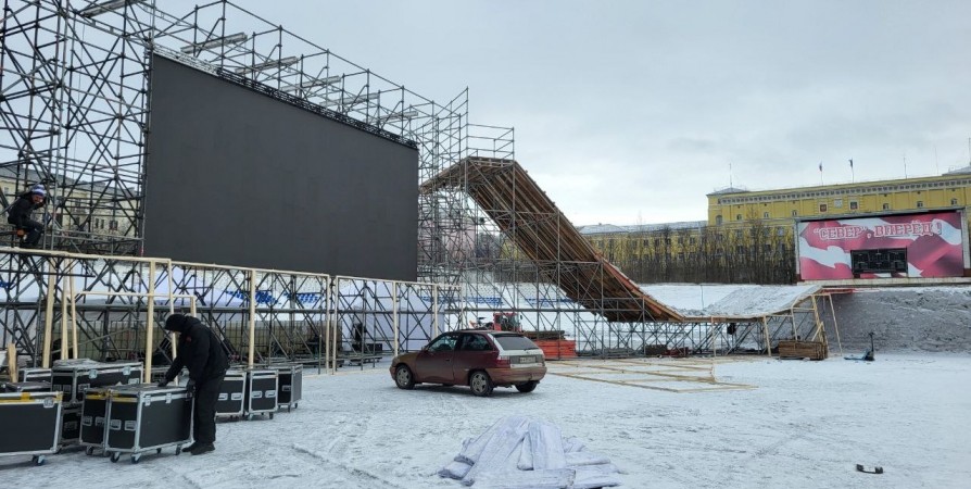 На стадионе Профсоюзов в Мурманске продолжается монтаж конструкций для проведения церемонии открытия 89-го Праздника Севера. Организаторы пообещали, что гостей ждет уникальное шоу. Свое мастерство продемонстрируют представители лыжного фристайла, удивят прыжками спортсмены, выступающие в дисциплине биг-эйр и прямо по стадиону перед зрителями промчатся снегоходы.