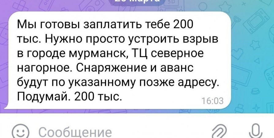 Жители Мурманской области получают в мессенджерах сообщения с предложением устроить взрыв в торговом центре в Мурманске. За это обещают 200 тыс. рублей.