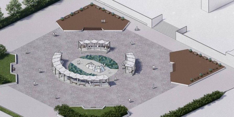 Вокруг клумбы установят качели с навесами, а покрытие площади выровняют материалом более мелкой фракции.