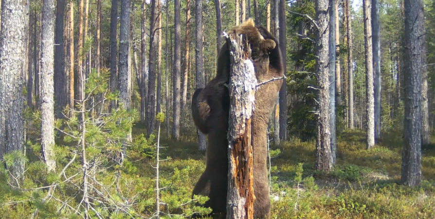 А в Кандалакшском заповеднике в фотоловушку инспектора Василия Вощикова попал «танцующий медведь». Косолапый трется спиной об дерево.