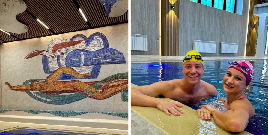 На опубликованном фото бассейна видно, что на одной из стен выложено мозаичное панно в советском стиле, где изображен пловец.
