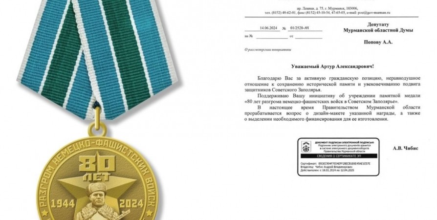 Информация содержится в ответе губернатора Мурманской области Андрея Чибиса, который сообщает, что поддерживает идею парламентария об учреждении медали.