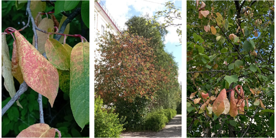 Жители Апатитов обеспокоены состоянием черемухи, которая растёт в городе. Листья и на больших, и на маленьких деревьях в разных районах города начали желтеть, покрываться розоватыми точками и засыхать.