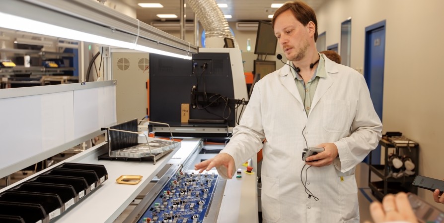 Производство действительно то место, где отчетливо понимаешь – будущее наступило. На стенах типичного заводского коридора фотоколлажи об этапах развития от выполнения плана на радиоэлектронном заводе в период советских пятилеток до сегодняшнего дня. Последние кадры – 2023 год – торжественное открытие производства ООО «НПО РТТ». В конце коридора с плакатами – дверь, а дальше стерильные, почти как в больнице, помещения, в которых производят технологический суверенитет страны.