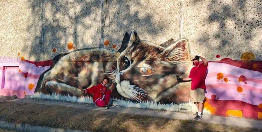 Мурлыку нарисовал Роман Гвоздев. Причем сделал это во время своего приезда в Умбу к родителям. Пушистый лежебока появился потому, что для этой работы у Романа были с собой краски нужных оттенков, а создание граффити не требовало привлечения дорогостоящей техники - автовышки.