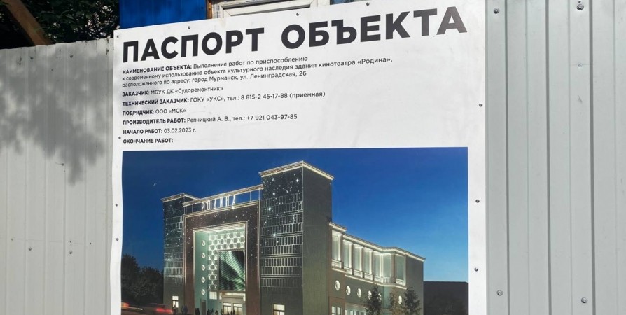 Графа «Срок сдачи работ» на информационном стенде на реконструкции кинотеатра «Родина» в Мурманске оказалась пустой. На изменения обратили внимание читатели Nord-News.