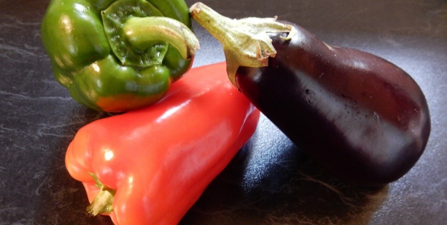 1. Во-первых, тщательно моем все наши овощи. Перец разделаем на части и убираем сердцевину. Баклажаны также нарезаем на половинки или крупные дольки. Выкладываем все на кулинарную бумагу, которой покрываем противень. И отправляем в духовку запекаться. Можно также использовать мангал по желанию.