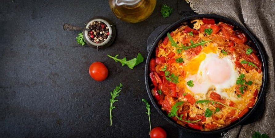 Ингредиенты: 5 яиц, 3–4 томата, болгарский перец, луковица, специи и зелень по вкусу.
