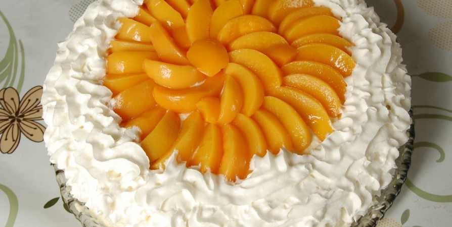 4. Подготавливаем форму. Переливаем приготовленную массу в форму, равномерно распределяя ее по дну. Нарезаем оставшиеся персики дольками и красиво раскладываем их сверху. Накрываем торт пищевой пленкой и ставим в холодильник минимум на 2 часа, а лучше на ночь. За это время торт хорошо застынет и станет еще более вкусным.