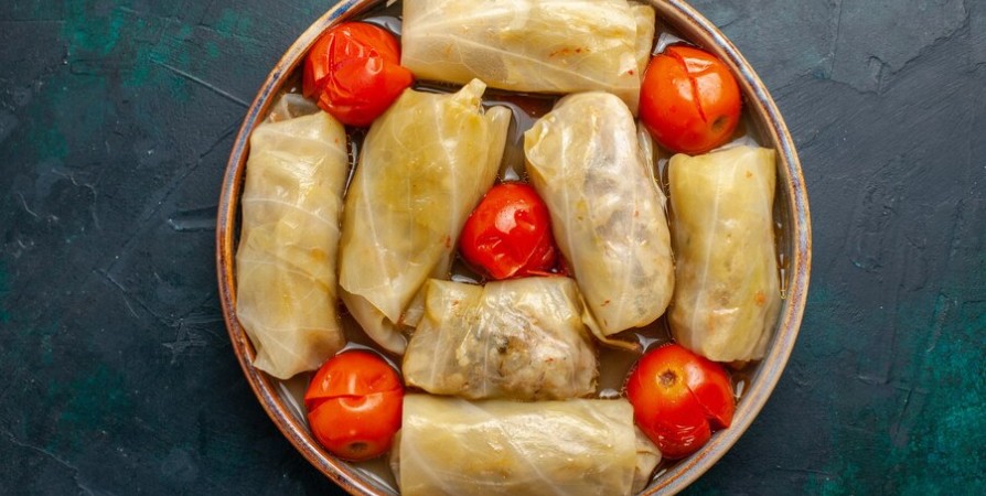 6. В глубокой форме для запекания разместите готовые голубцы. В отдельной миске смешайте бульон с томатной пастой и залейте этой смесью голубцы. Запекайте в заранее разогретой духовке при температуре 180°С в течение 30–40 минут.