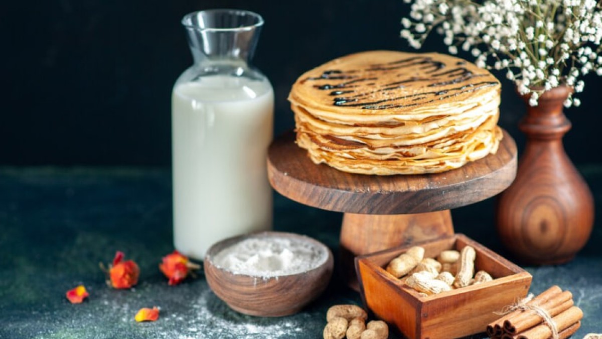 Для приготовления опарных русских блинов потребуется: 600 г муки, 800 мл молока, 25 г дрожжей, 3 крупных куриных яйца, 100 г сливочного масла, соль и сахар по вкусу.