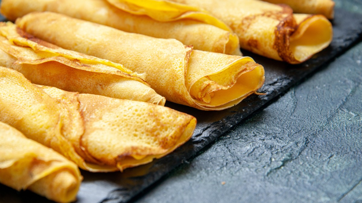 Чтобы приготовить примерно 20 блинчиков, нам понадобятся: 200-граммовый ванильный творожный сырок, 4 яйца, 400 грамм кефира, 300 грамм муки, 30 грамм сахара, соль, 7 грамм соды, 400 мл горячей кипяченой воды и растительное масло, примерно 50 грамм.