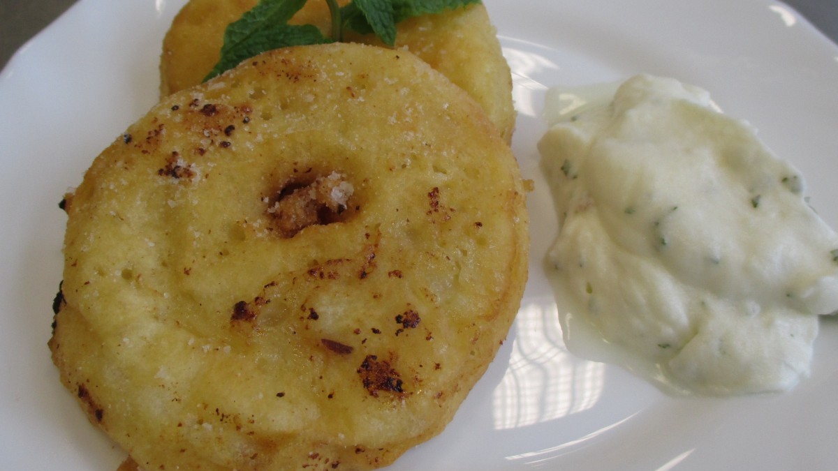 Картофель (700 г) натереть на мелкой тёрке, добавить соль, перец, 1 ст. л. сметаны (чтобы не темнели), обжаренный мелко нарезанный лук (2 шт.) и немного муки (1-2 ст. л.). Вбить 1 яйцо и перемешать.