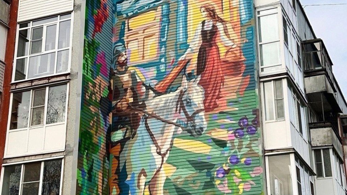 Монументальное изображение девушки и всадника придало зданию яркости.