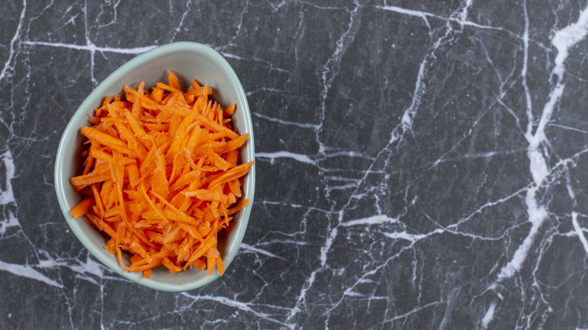 Морковь натрите на терке тонкой соломкой. Такой способ нарезки сделает ее хрустящей и равномерно пропитанной маринадом.