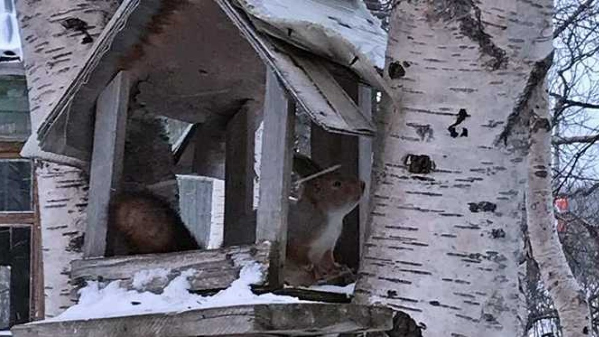В Полярно-альпийском ботаническом саду Кировска в один из непогожих дней белка забралась в кормушку для пернатых и не пускала туда птиц.