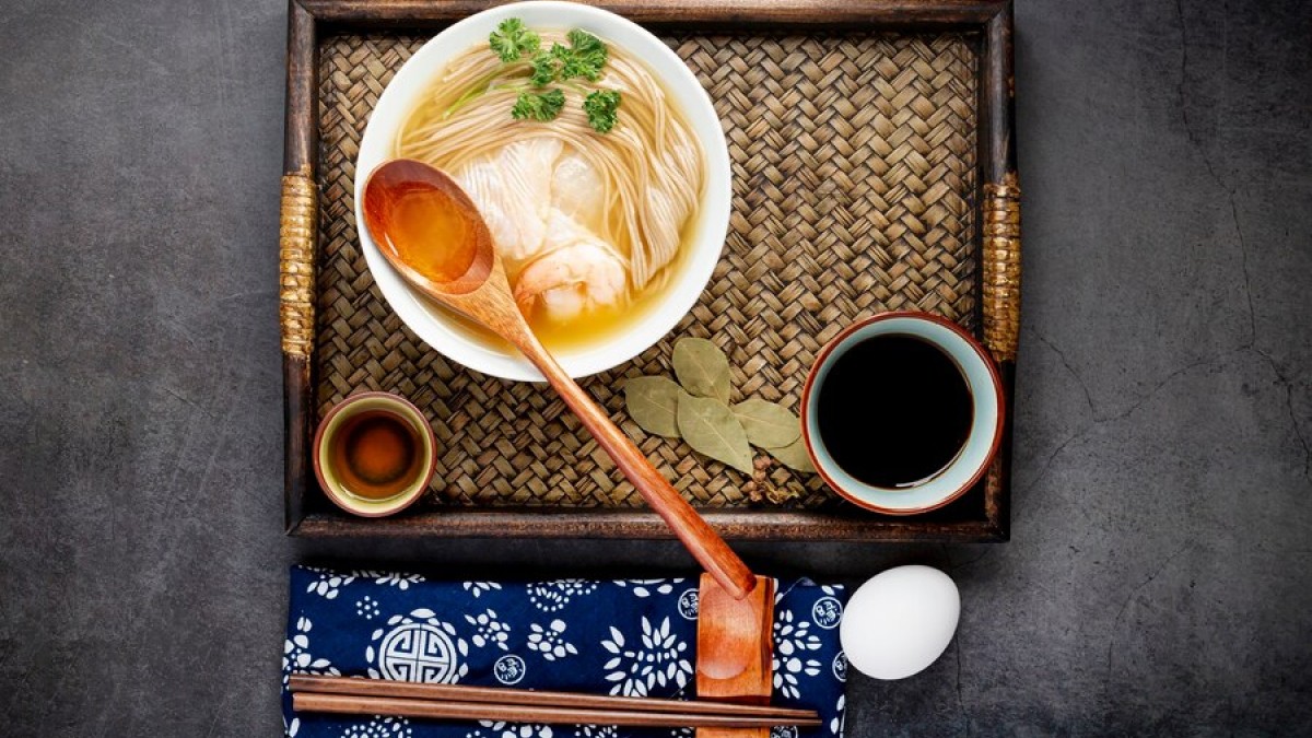 Через 30 минут достаем курочку из бульона и даем остыть. Лук и имбирь также стоит удалить. Вместо них необходимо добавить в бульон светлый соевый соус, немного кунжутного масла и специй по вкусу.