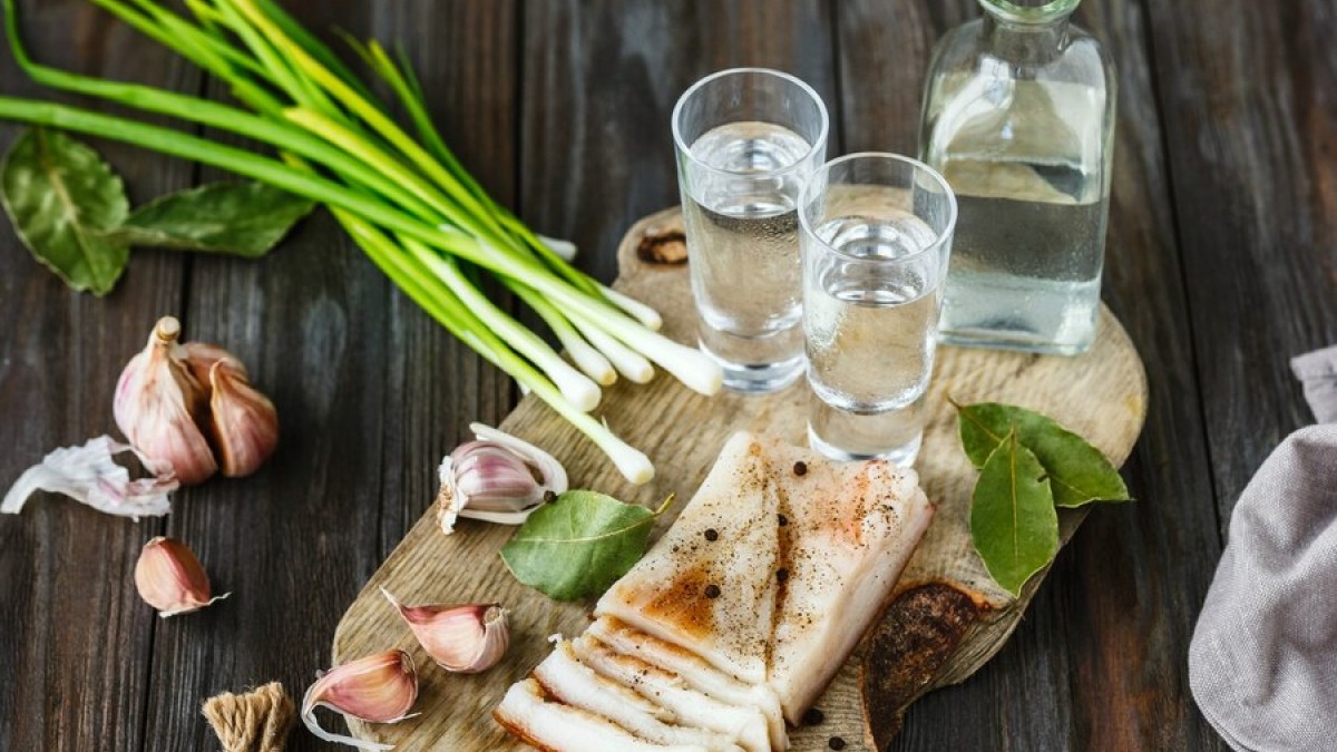 Для приготовления понадобятся: тонкое сало со шкурой (толщиной до 1,5 см), лук, морковка, головка чеснока, листа лавра и специи.