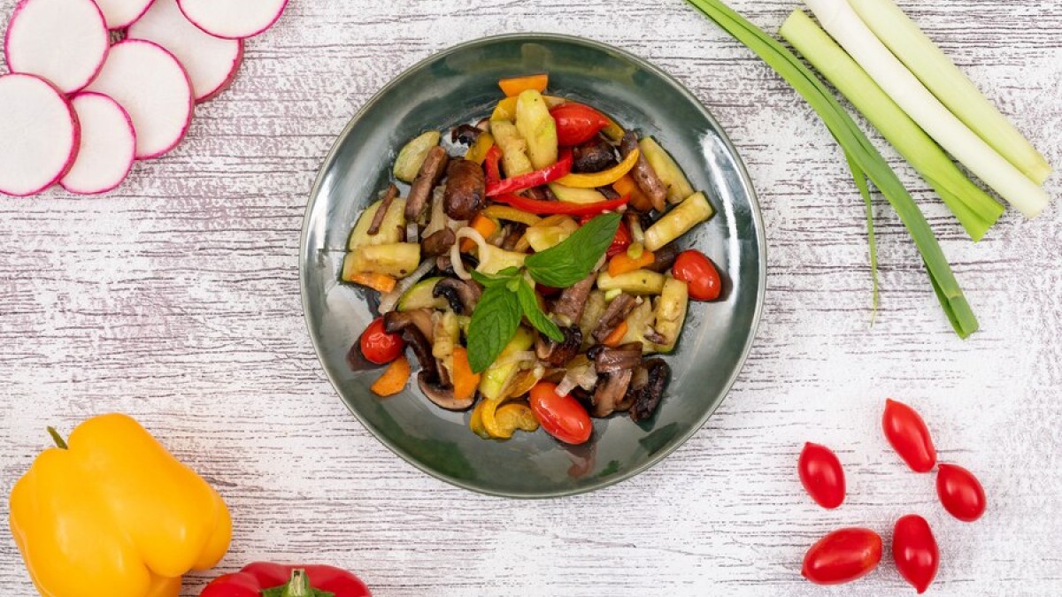 Теперь собираем все блюдо. Вкладываем в тарелку нарезанный перец чили, лук кинзу и гриба. Заправляем сверху соусом и перемешиваем.