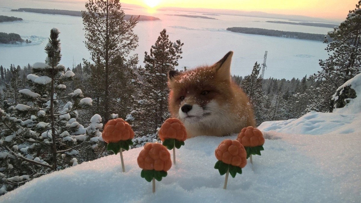Огненная лисичка приняла участие в фотосессии на Кандалакшском перевале.