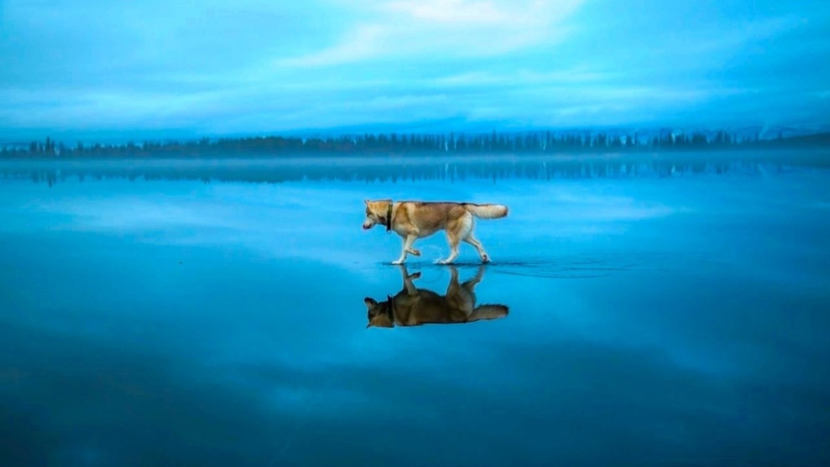 Из-за отсутствия снега прозрачный лёд на снимках выглядит как вода — хвостатые как будто передвигаются по глади озера.