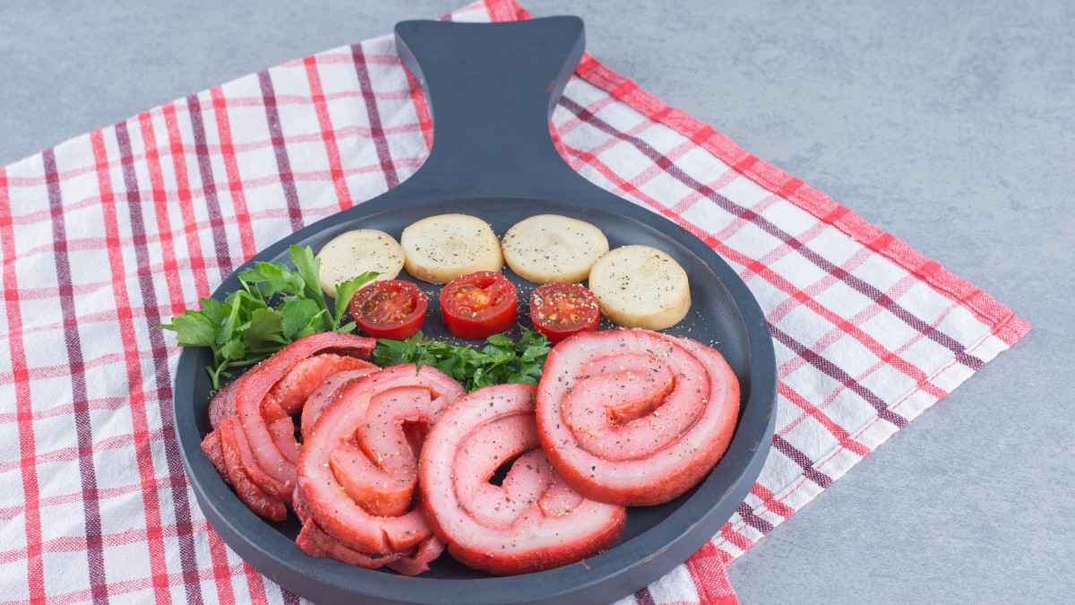 - Сверните мясо в плотный рулет, начиная с края с начинкой.