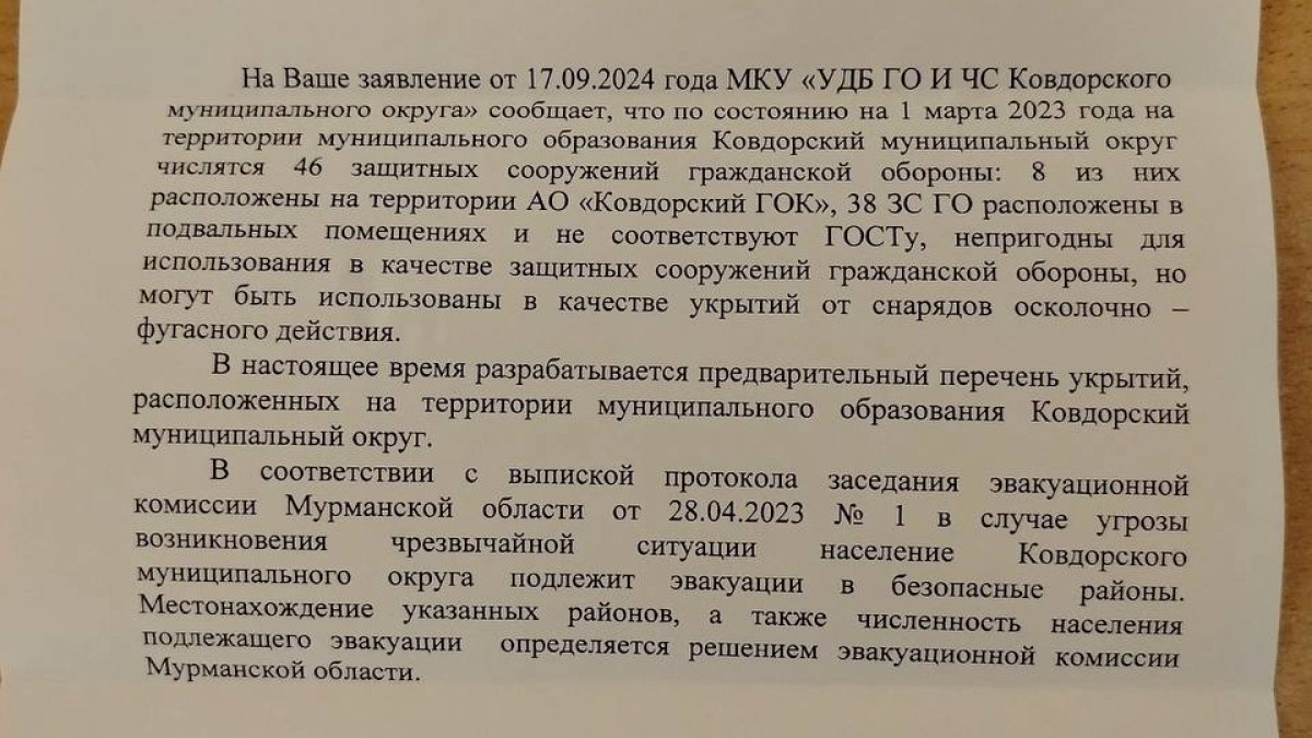 Информация стала известна после обращения граждан в «Управление по делам безопасности», чтобы узнать адреса убежищ. Ранее ковдорчане поинтересовались этим вопросом у главы округа — Сергея Сомова на онлайн-встрече с жителями, однако на их вопрос он конкретной информации не дал.