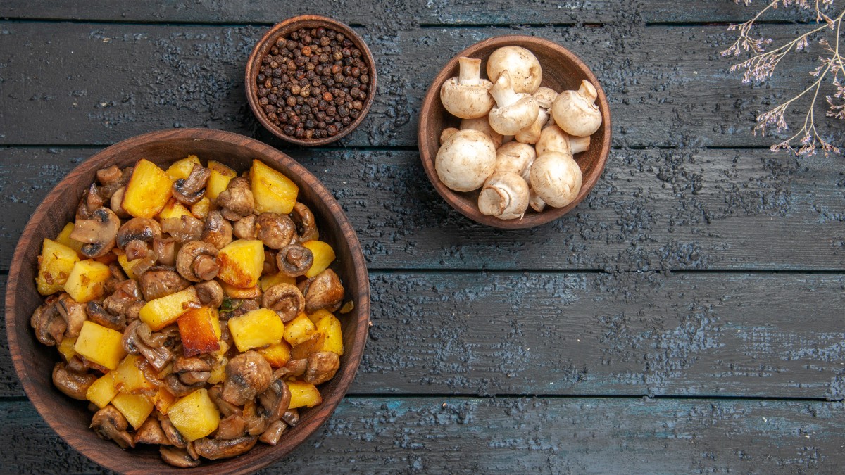 - Шампиньоны нарежьте пластинками и обжарьте вместе с луком до мягкости.
