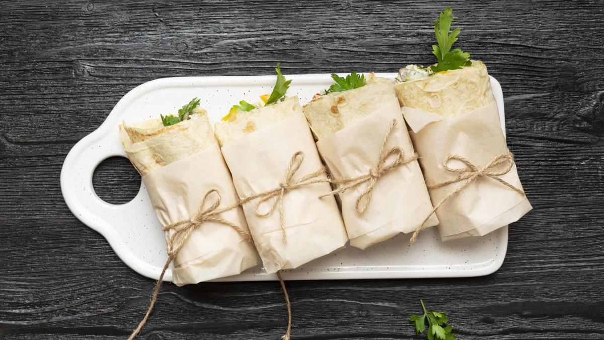 - Подогните края лаваша и сверните в плотный рулет.