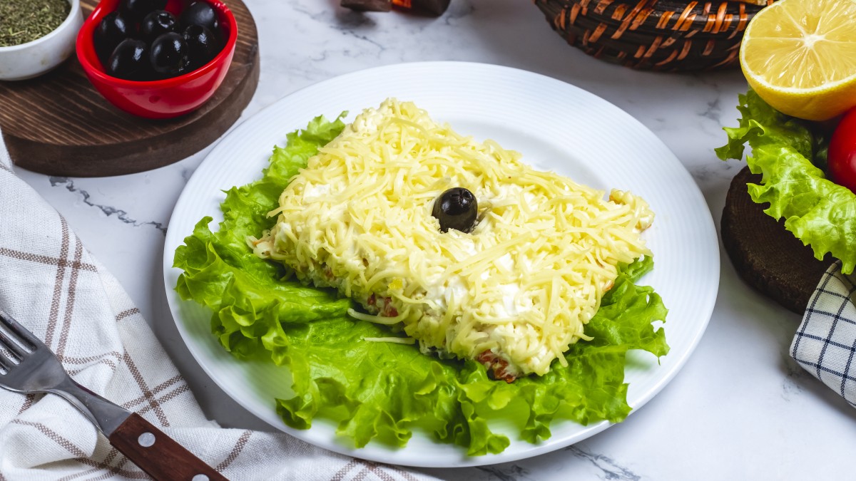 Равномерно посыпьте салат тёртым сыром.