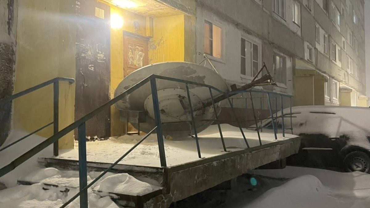 На улице Кирова в Североморске с одного из жилых домов сорвало антенну из-за сильной метели. «Летающий» объект спланировал почти на подъездный козырек. Немалой массой своего железного тела «тарелка» перекрыла вход и выход из подъезда, а также погнула перила на крыльце дома.