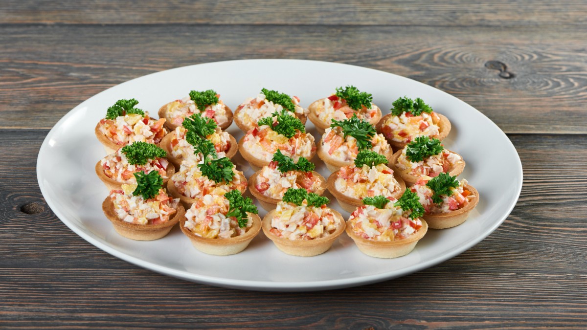 Далее достаем из духовки и заполняем тарталетки салатом.