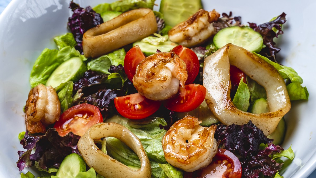 - Сборка салата. В глубокой миске соединяю яичные белки, кальмары, креветки и крабовые палочки. Заправляю всё майонезом. На этом этапе добавляю икру — она не полопается, если мы не перемешиваем её сразу с остальными ингредиентами. Салат украшаю оставшимися желтками и икрой.