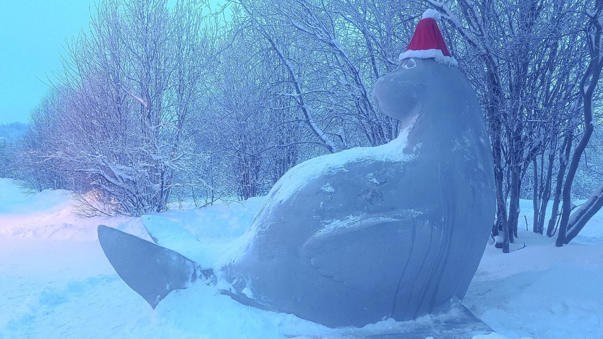 Бетонный тюлень Иннокентий, стоящий возле входа в здание Мурманского океанариума, решил принарядиться в преддверии праздничных дней.