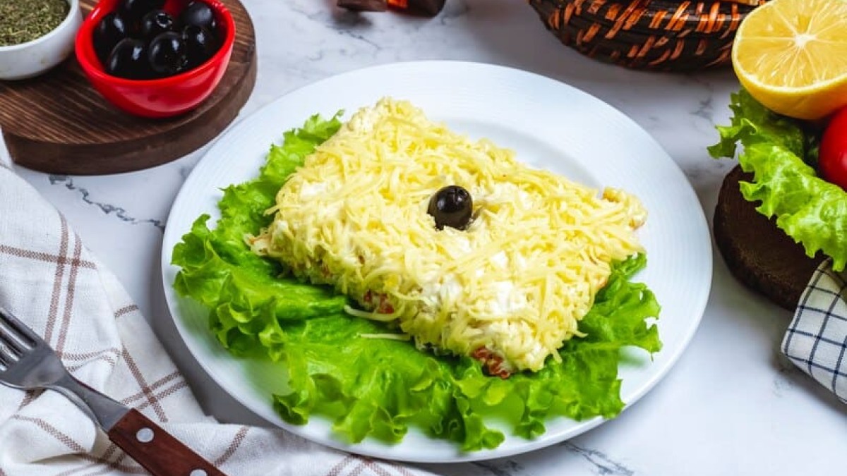 Подать салат можно на общей тарелке или порционно, отдельно для каждого гостя, украсив зеленью, оливками, лимоном или фигурками из отварных овощей.