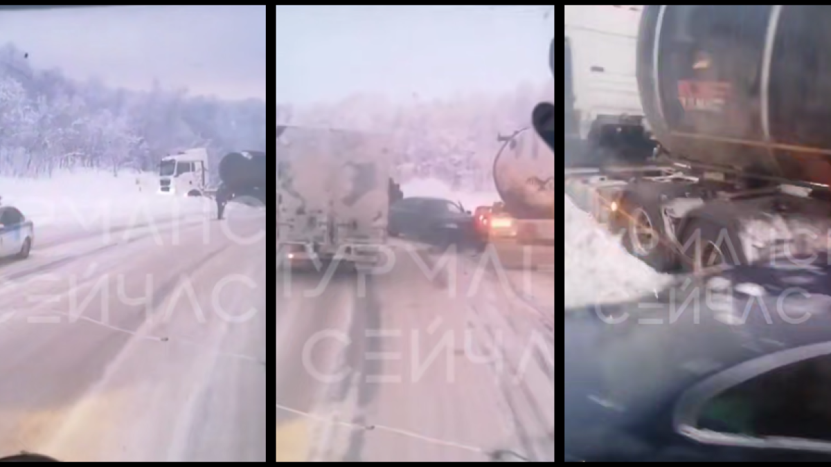 На размещенной записи видно, что бензовоз с черным прицепом находится в кювете, в бок машины врезалась легковая иномарка. О пострадавших не сообщается.