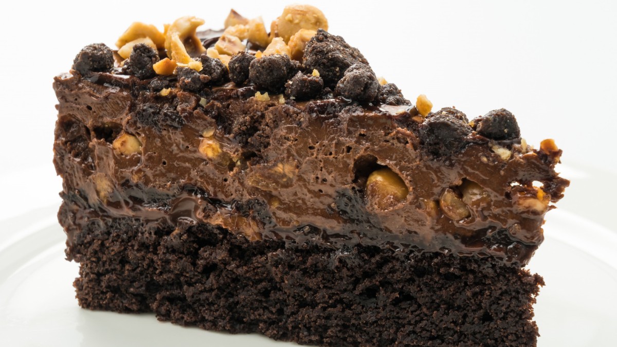 - Остудите бисквит, заверните в плёнку на 2–3 часа. Срежьте верхушку, измельчите её в крошку. Растопите шоколад, смешайте с арахисом. Обмажьте торт глазурью, посыпьте крошкой и украсьте.