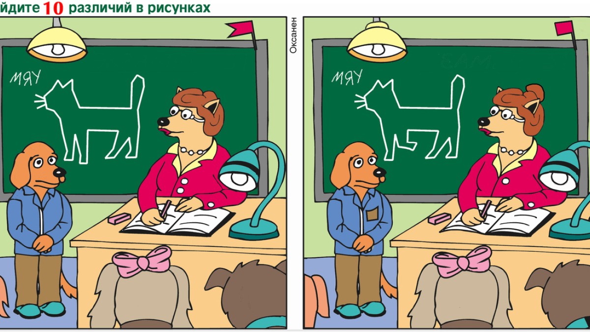 Найдите 10 отличий в школе для собак. Они изучают язык кошек.