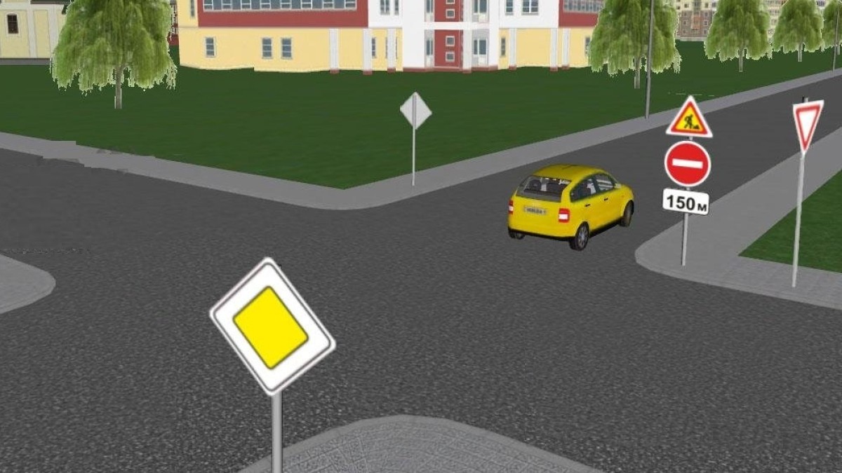 Как мы видим на картинке, водитель проезжает перекресток прямо. Сразу за перекрестком установлен знак «Въезд запрещен». При этом указано и расстояние до объекта — 150 метров.
