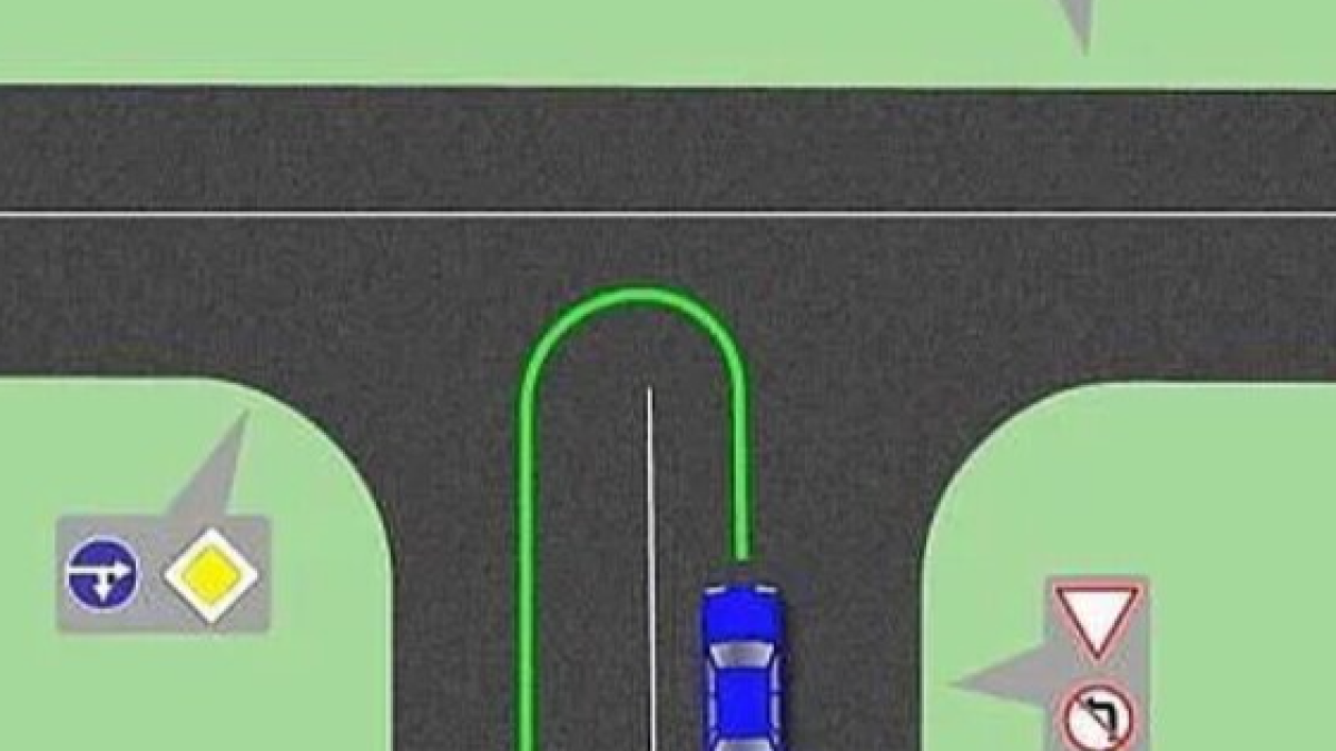 Среди дорожных ситуаций есть довольно сложные. Например, выполнение разворота под знаком «Поворот налево запрещен» или Т-образном перекрестке. В этой задачке совпали оба обстоятельства.