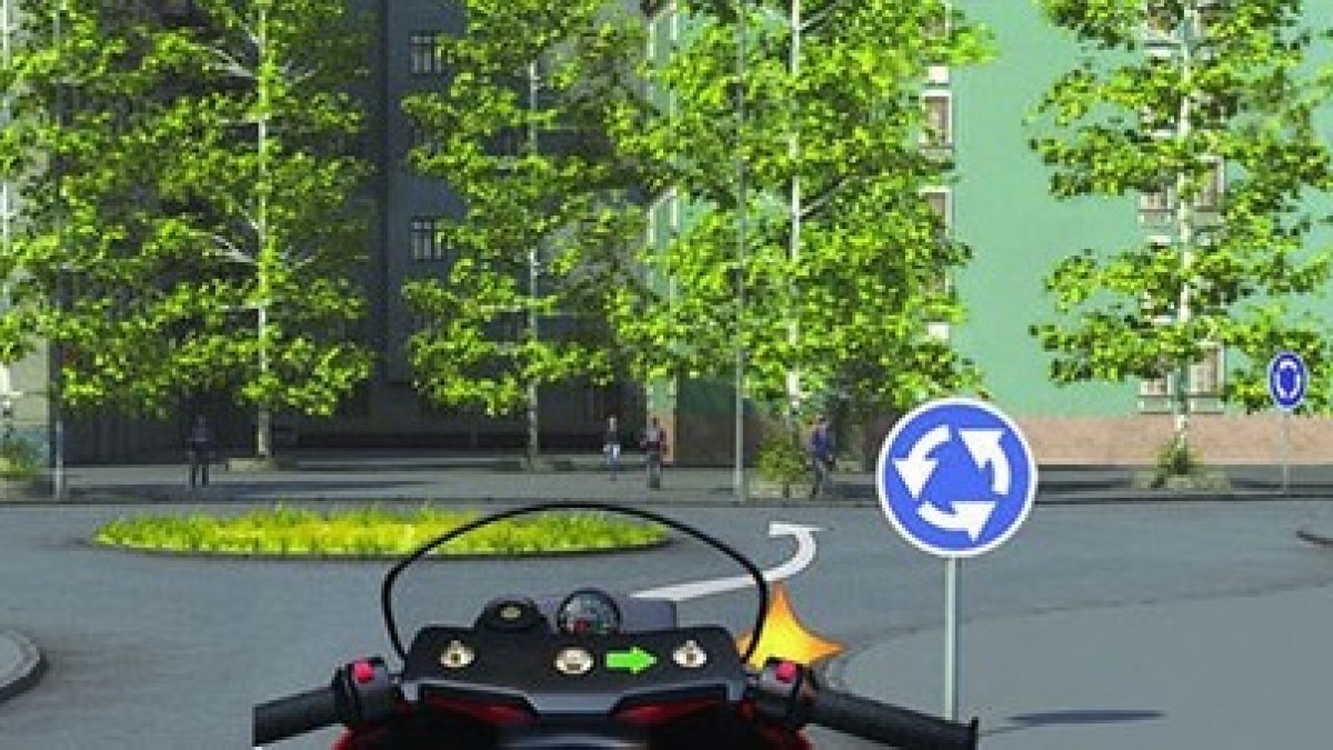 На круговом движении, где уже находится мотоцикл, легковой автомобиль только собирается въехать в кольцо.