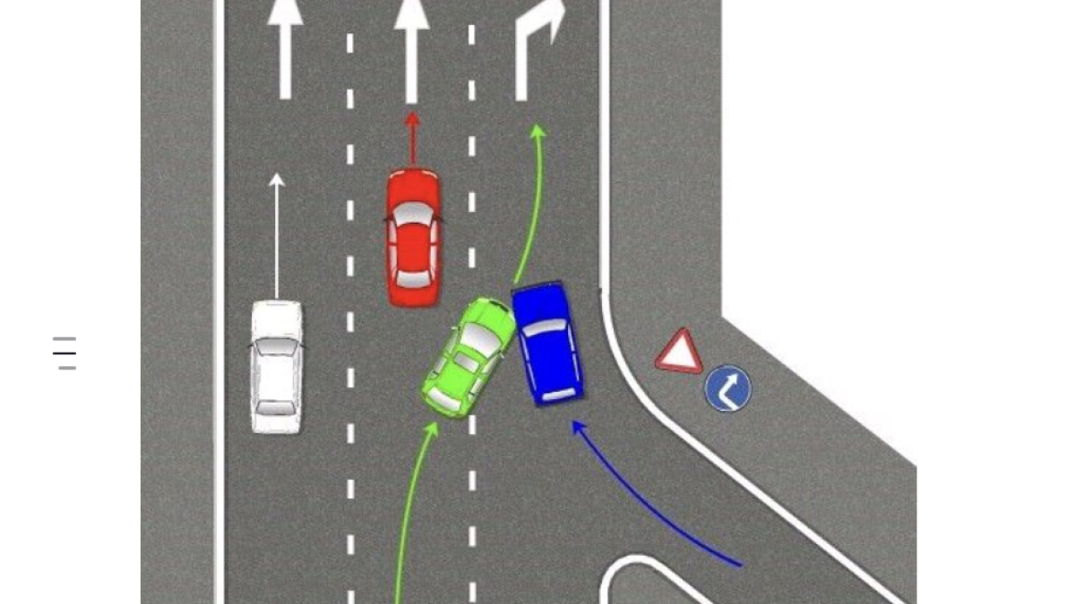 Рассмотрим ситуацию подробнее. Синяя машина уже была на крайней правой полосе в момент перестроения. Это говорит о том, что у зеленого была помеха справа. Из чего можно сделать вывод, что виноват водитель зленой машины.