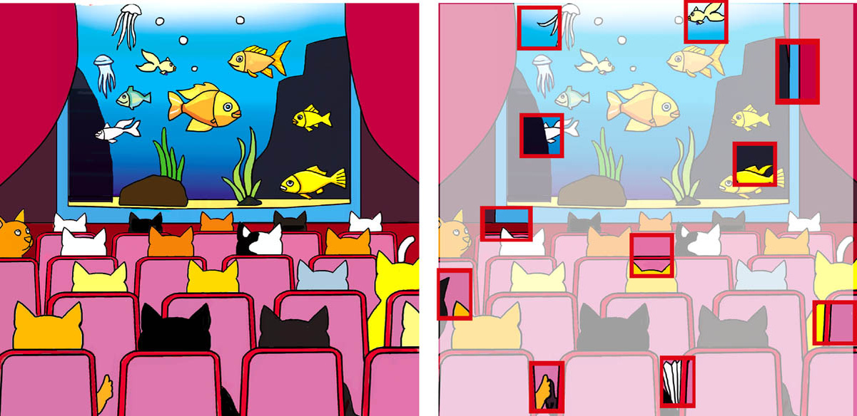 Сюжет картинок, можно сказать, театральный. Представители семейства кошачьих пришли в театр посмотреть представление с рыбами, отдохнуть и отвлечься.