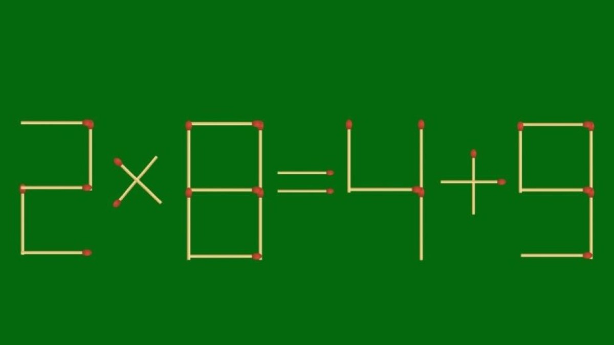 В уравнении из спичек 2 × 8 = 4 + 9 нужно переложить на другое место всего 1 спичку, чтобы оно стало правильным.