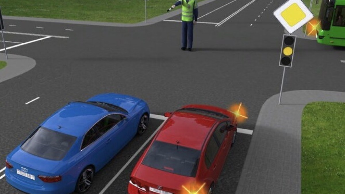 А вот синяя машина должна подождать, так как регулировщик пока что запрещает ему движение.