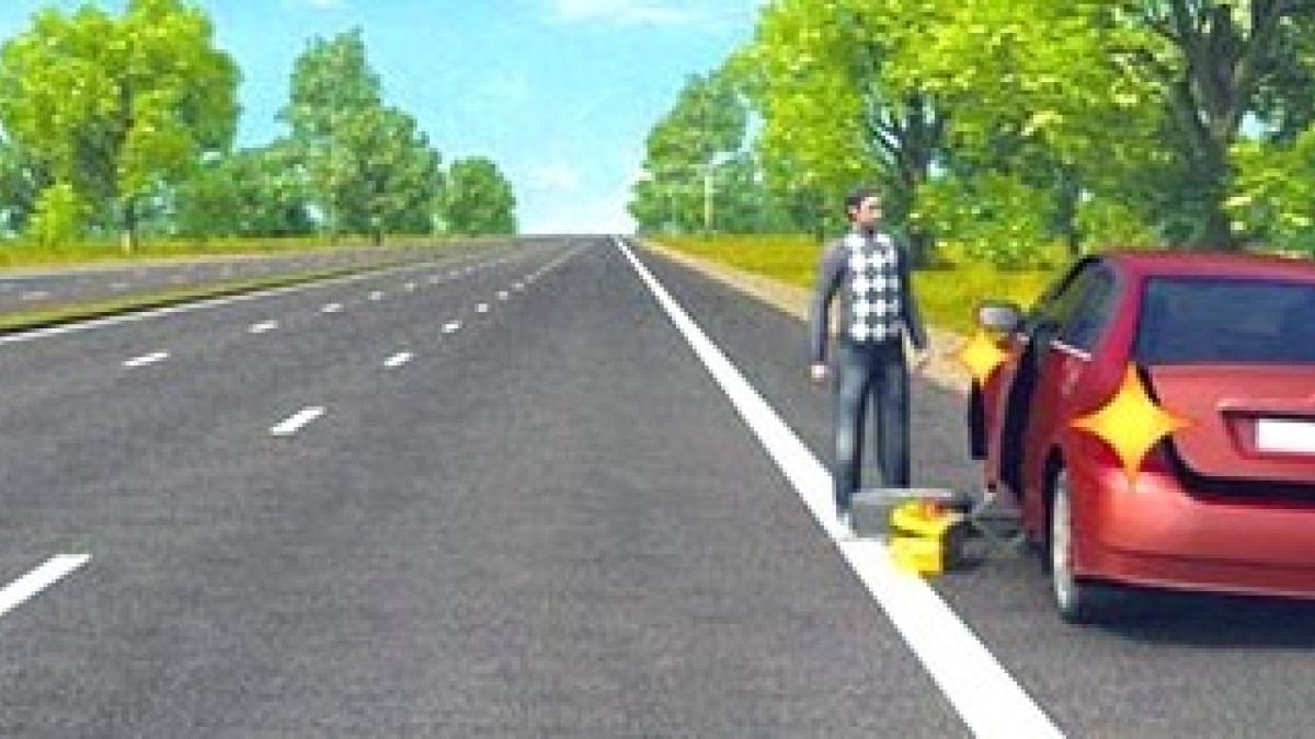 На картинке водитель остановился из-за пробитого колеса. Он включил аварийку, но не поставил знак аварийной остановки.