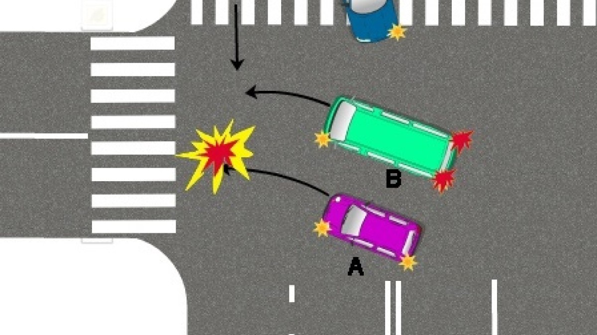 Сегодня разберём интересный случай. На картинке два автомобиля — А и В — поворачивают налево и сталкиваются с машиной С. Давайте выясним, кто виноват.